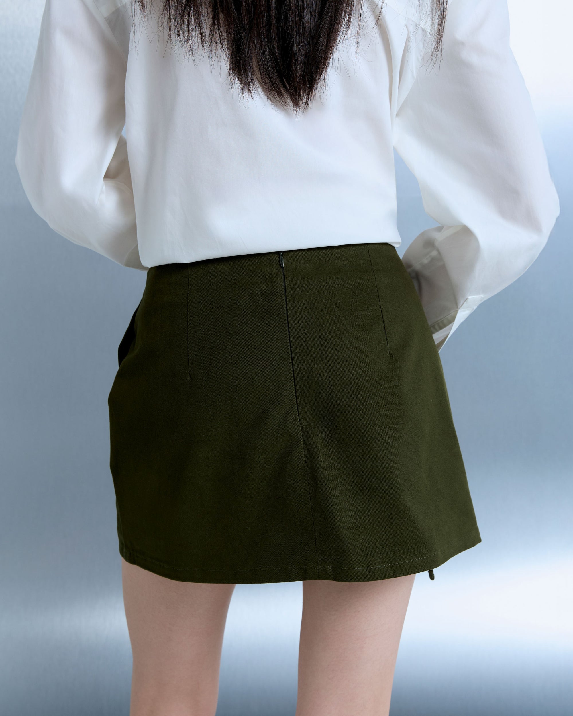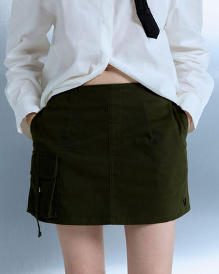 An A-line mini skirt crafted from a cotton-blend fabric, defined by a structured silhouette with a back zip closure and a mini cargo pocket. Built-in lining shorts provide added coverage and confidence with every movement.