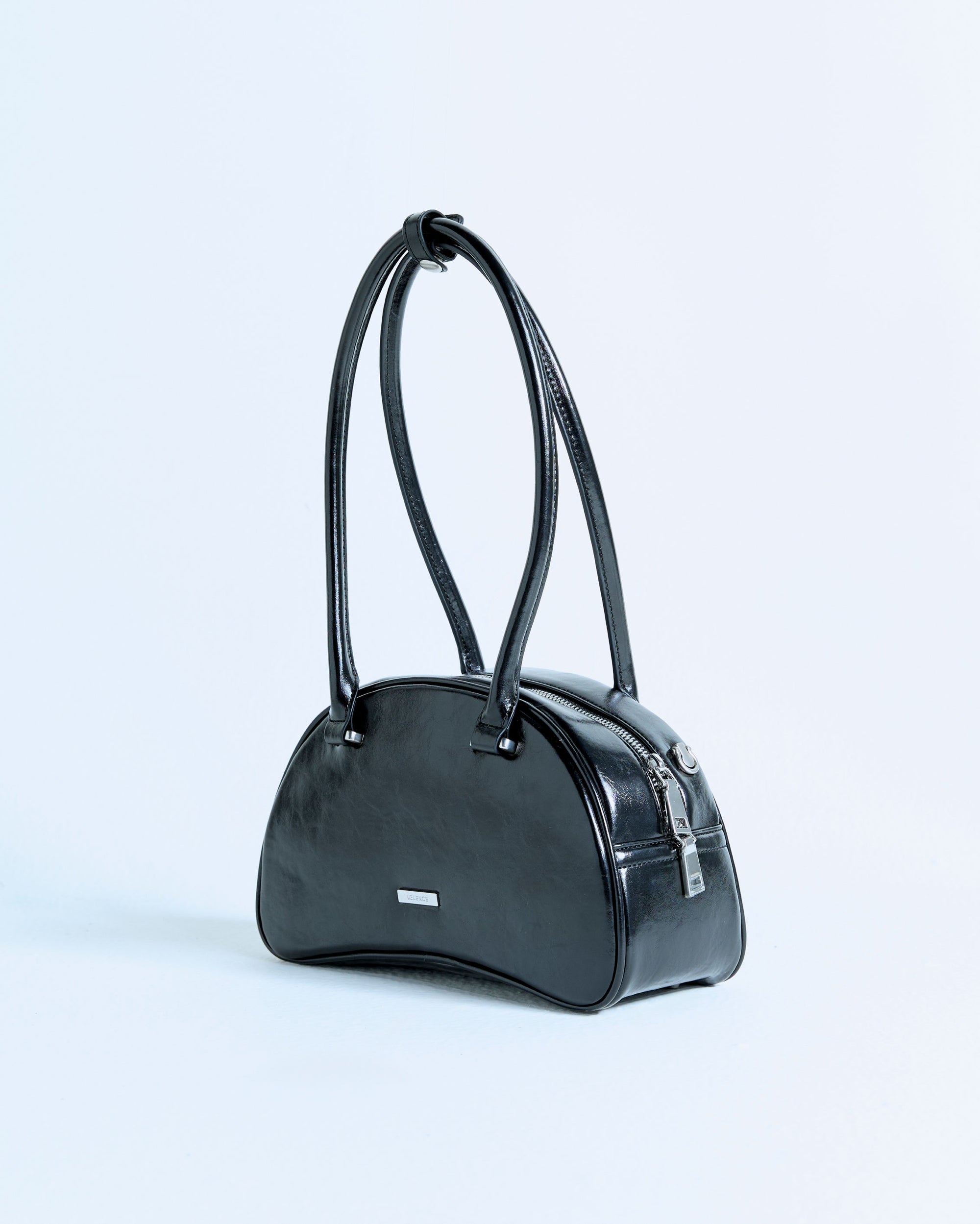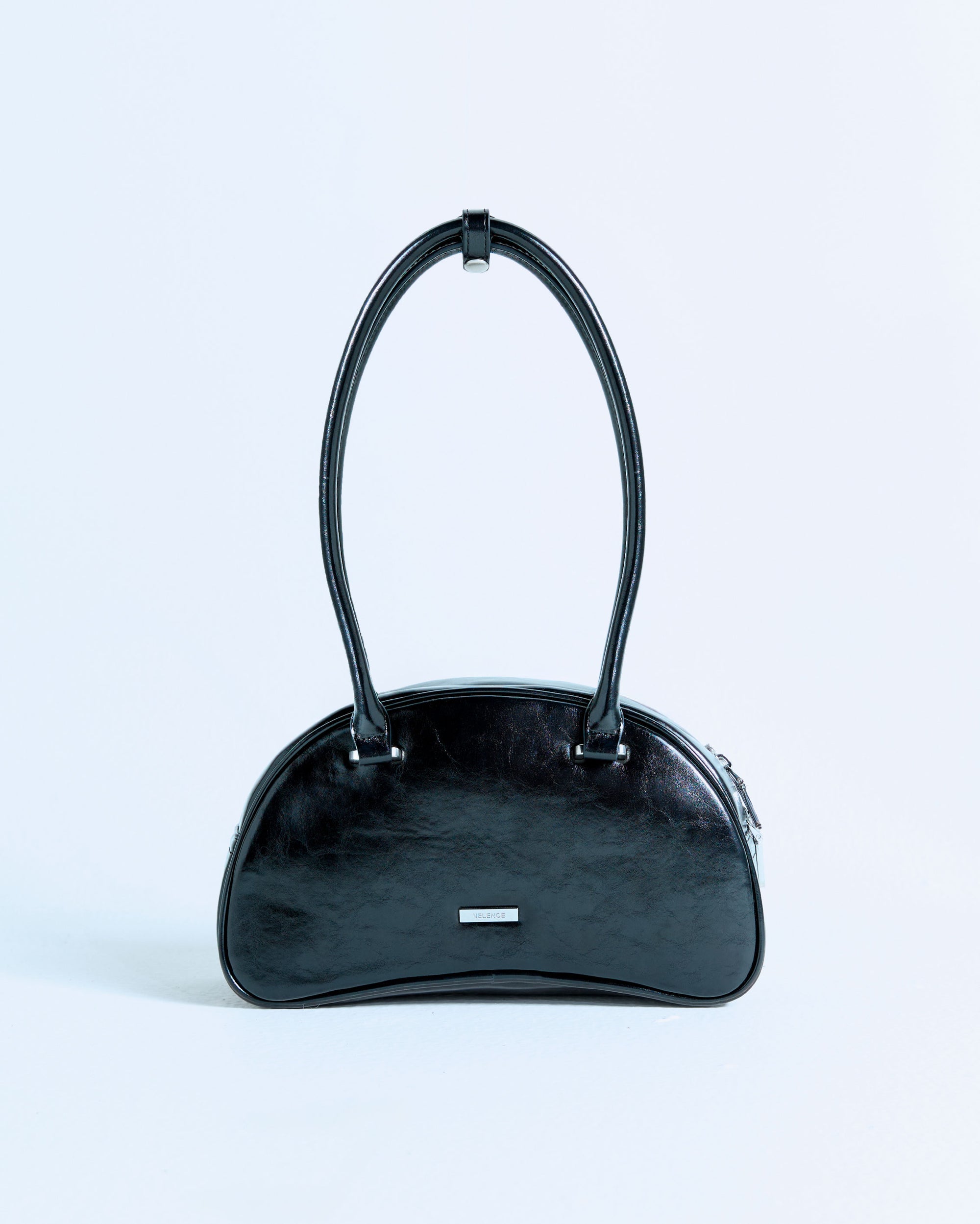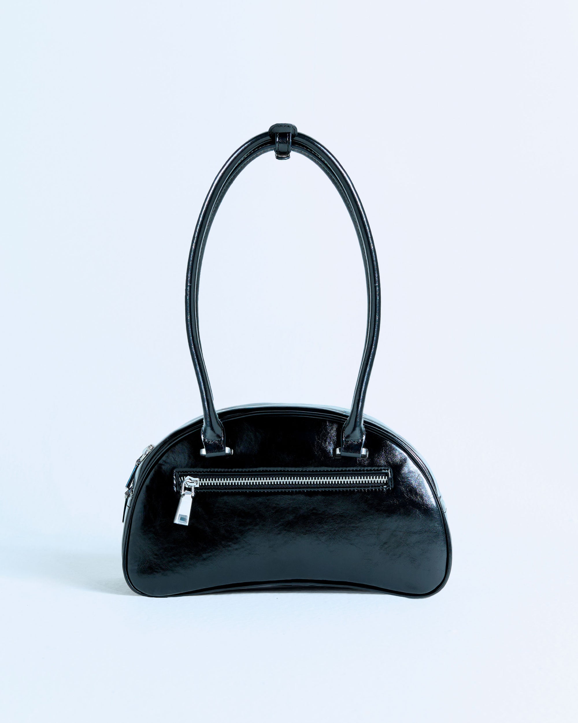 Half-orbit shoulder bag crafted from shiny vegan leather, designed to maintain a defined silhouette. Finished with a VELENCE logo plate, a top zipper closure, and a concealed back zip pocket. Includes a dedicated hoop for attaching the Reflect V Keychain.