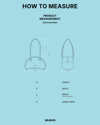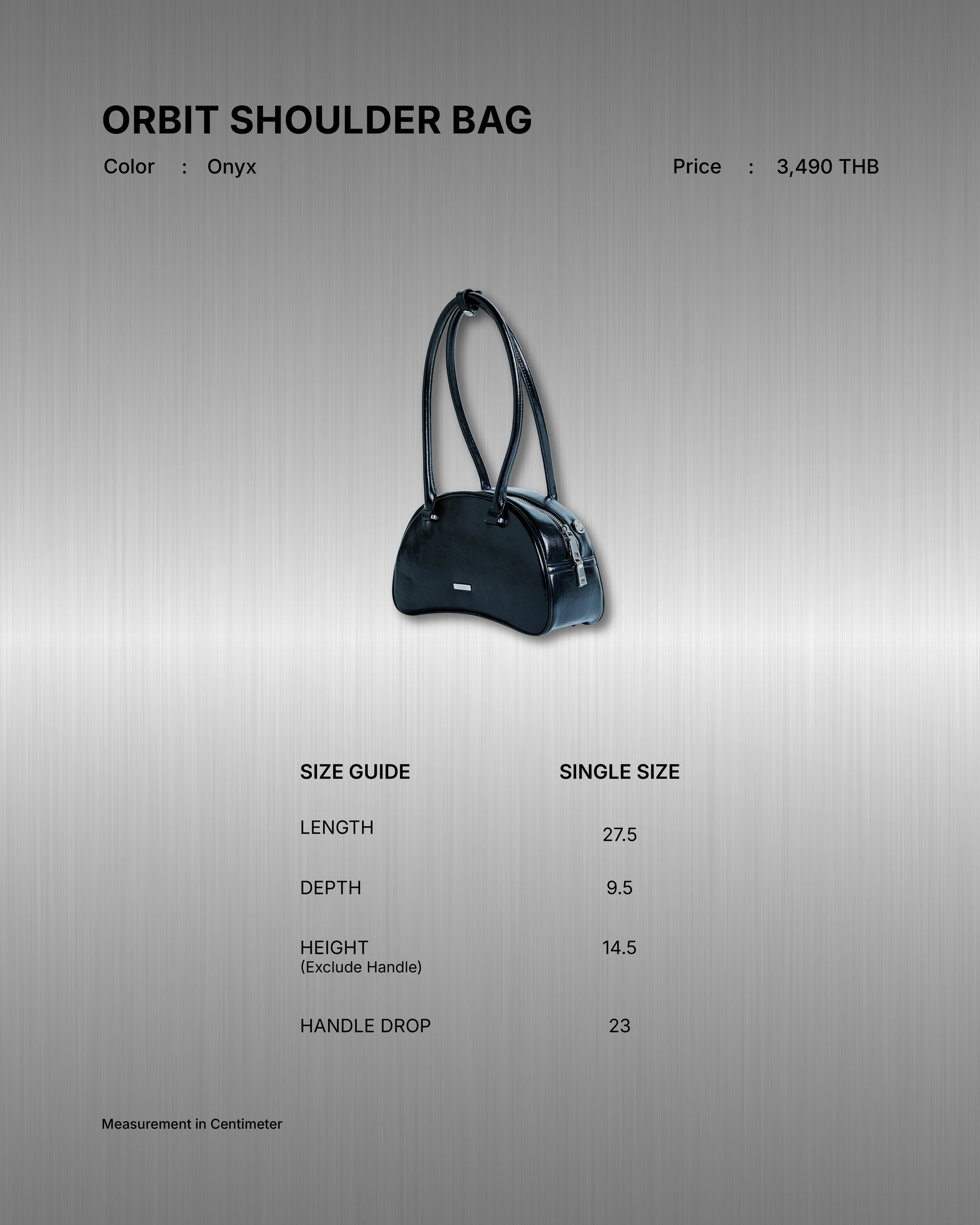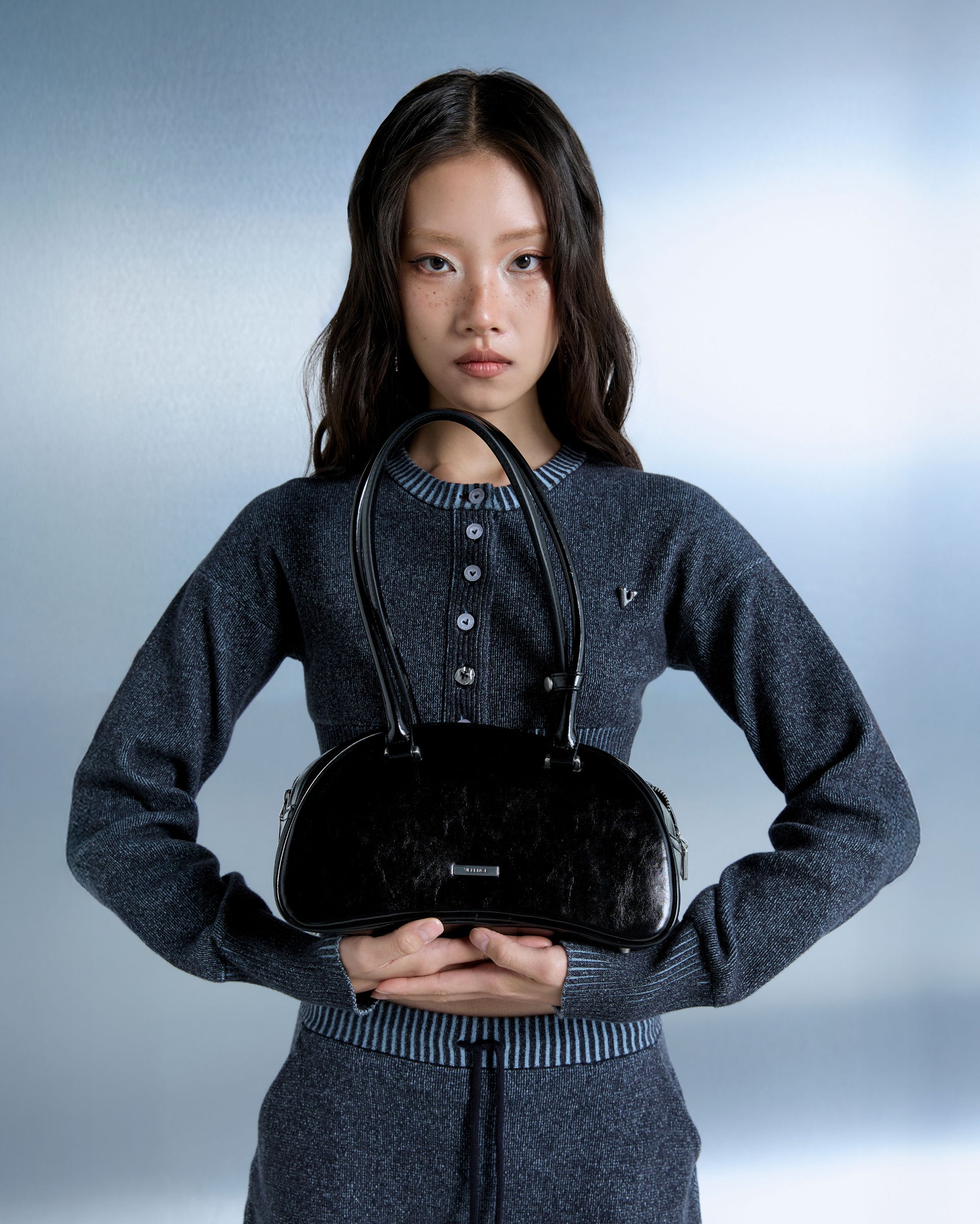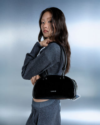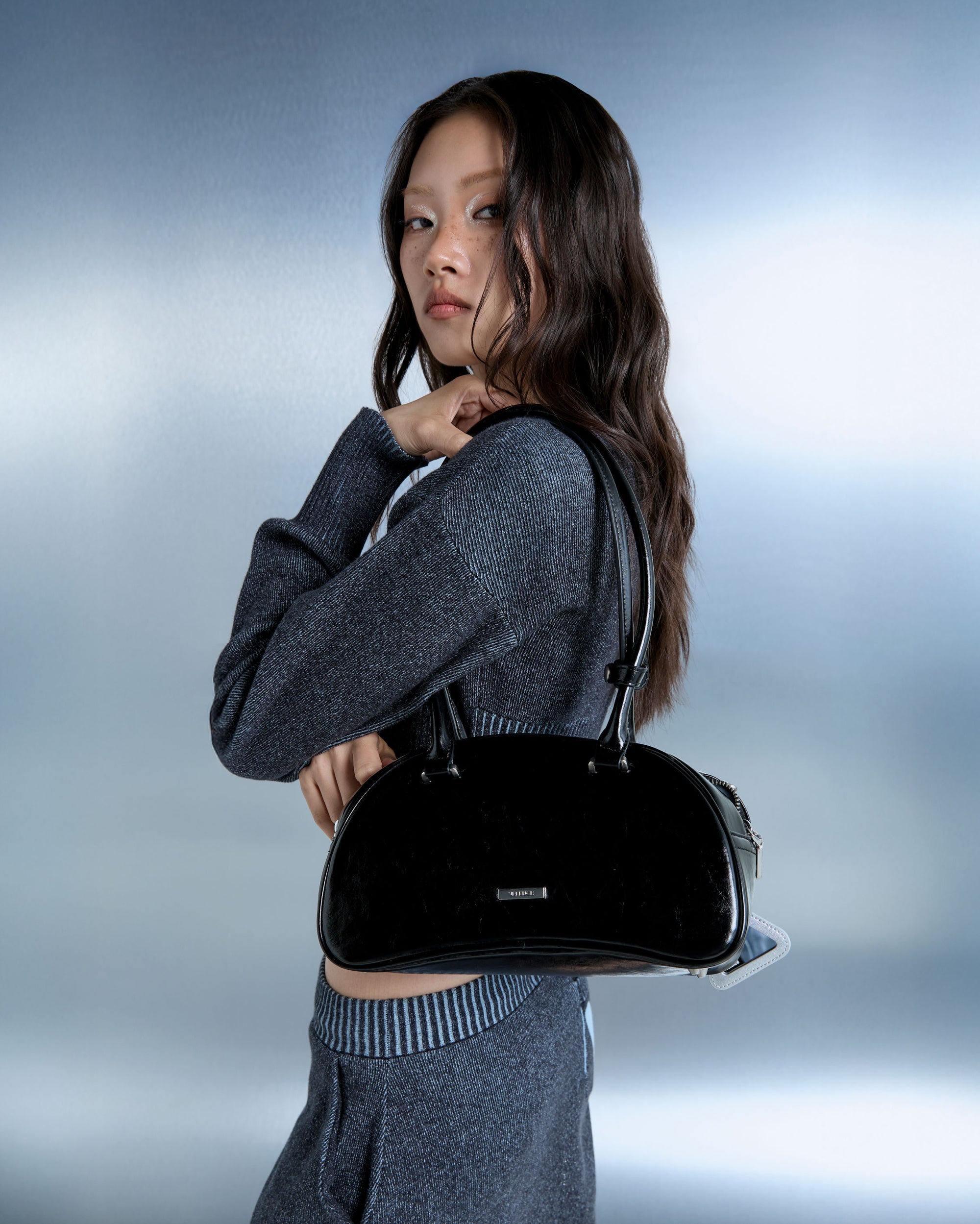 Half-orbit shoulder bag crafted from shiny vegan leather, designed to maintain a defined silhouette. Finished with a VELENCE logo plate, a top zipper closure, and a concealed back zip pocket. Includes a dedicated hoop for attaching the Reflect V Keychain.