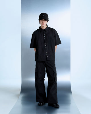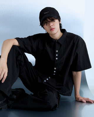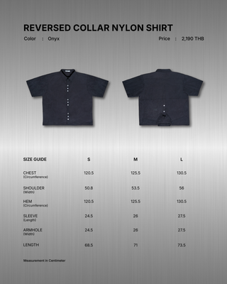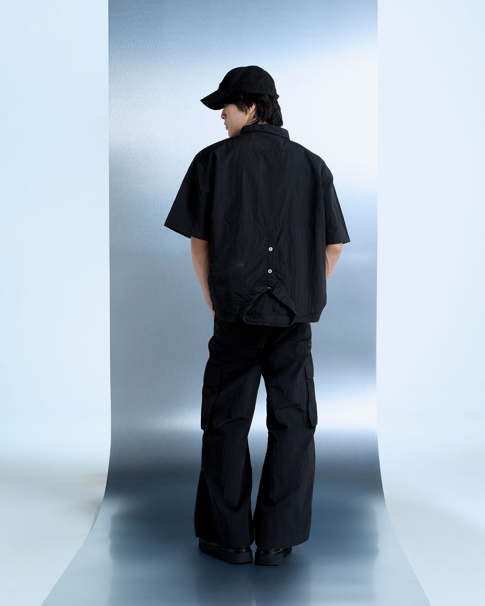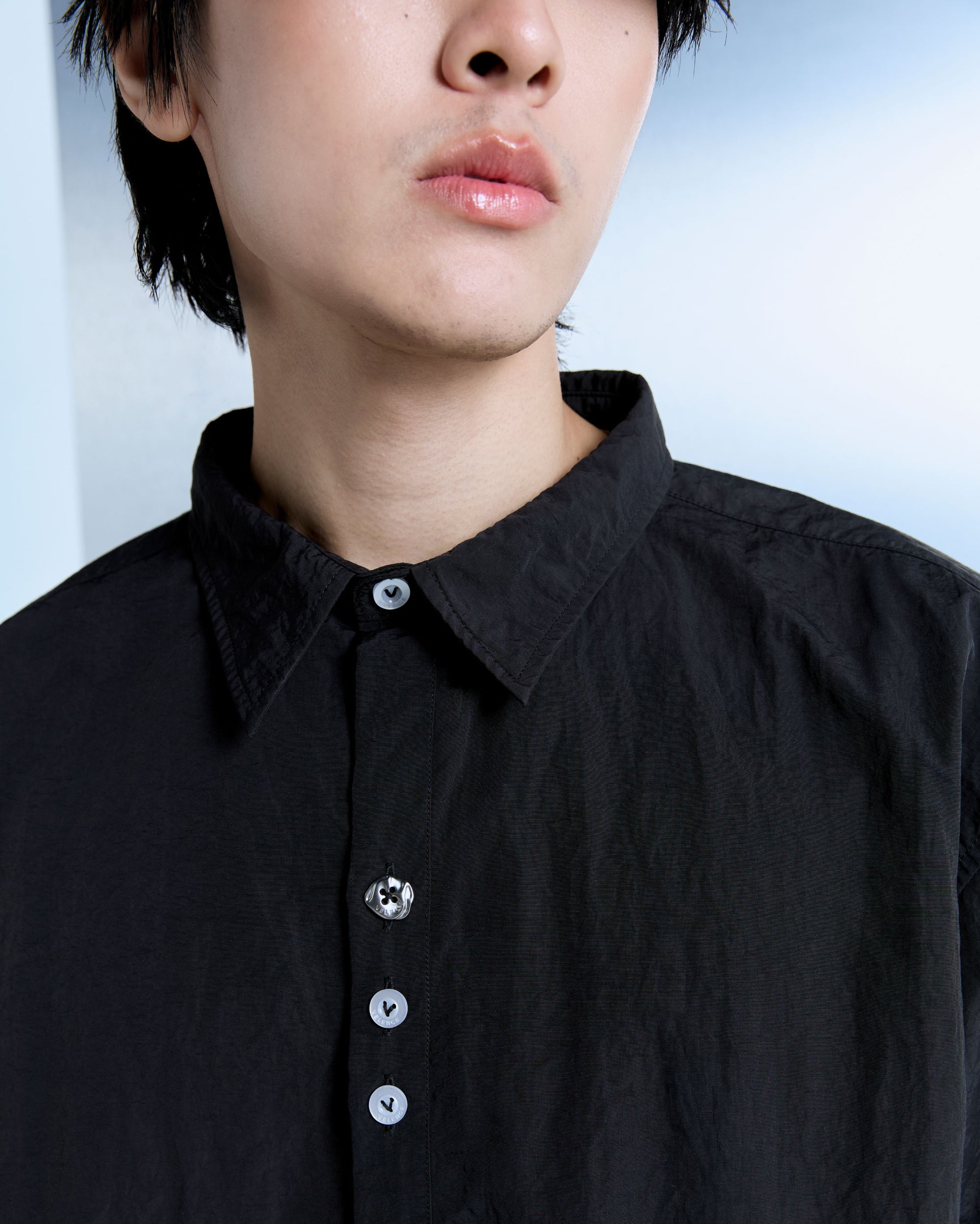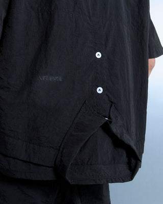 Boxy shirt crafted from fine nylon fabric, designed with a reversed collar at the back and an alternating button closure. Finished with a subtle VELENCE logo, balancing technical precision with a clean silhouette.