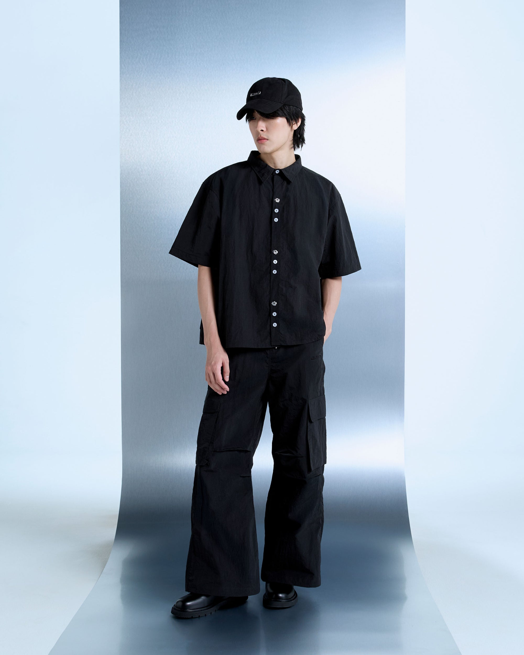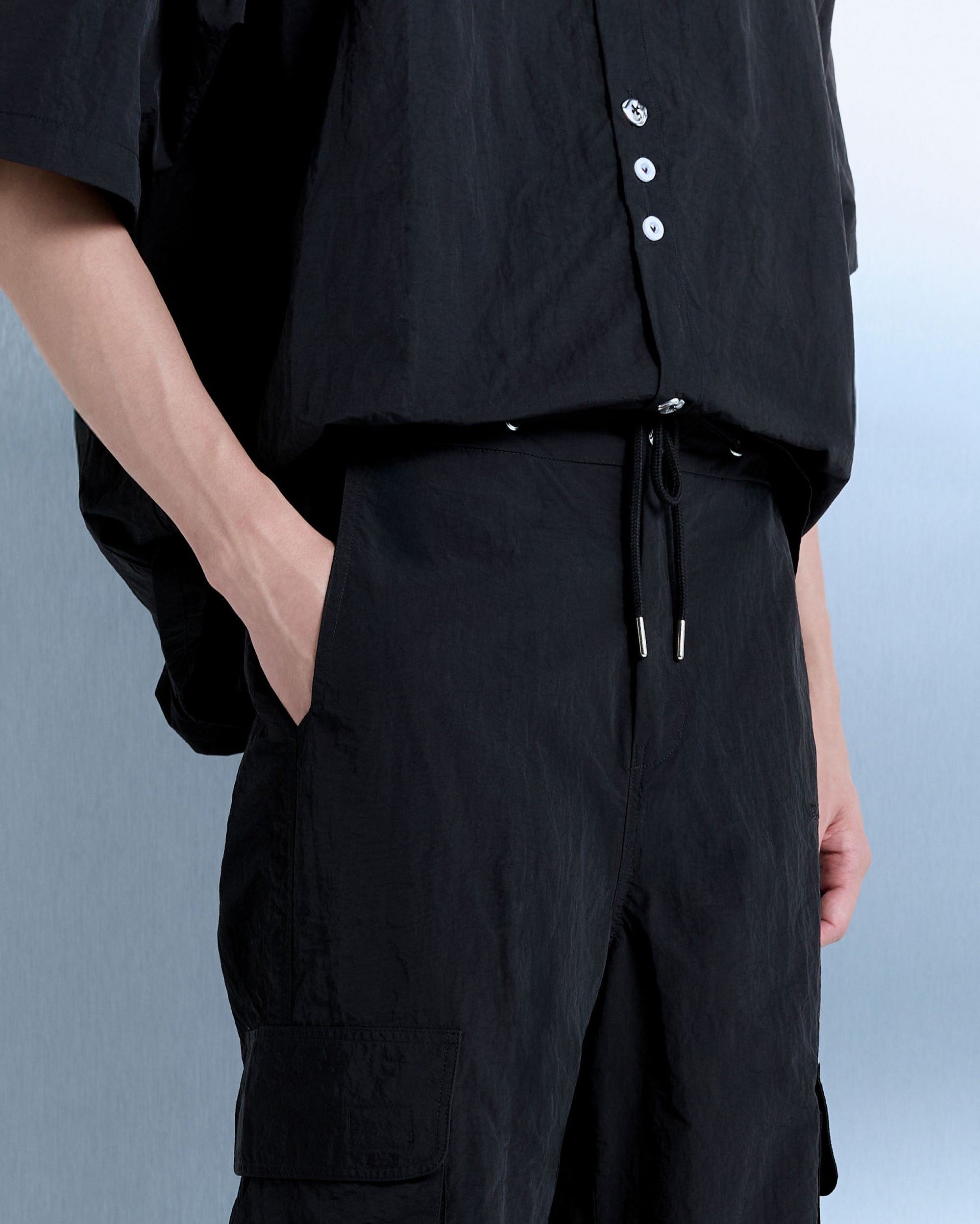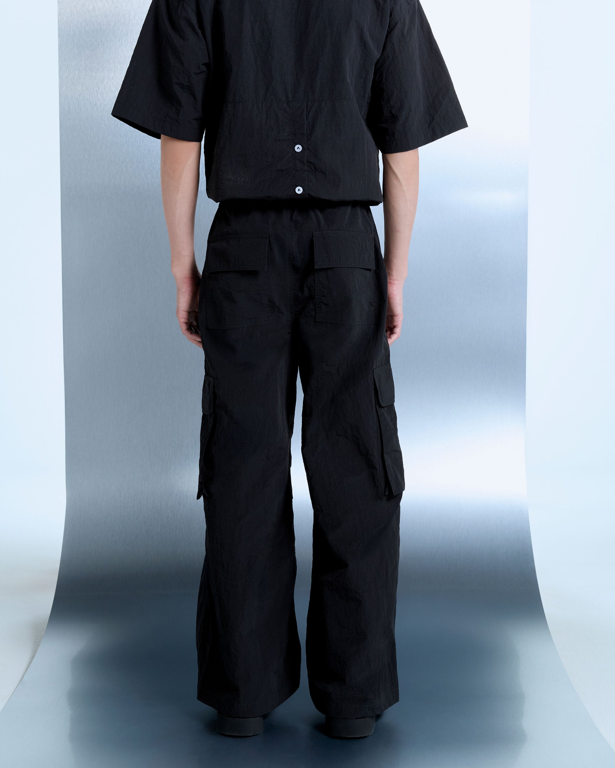 Relaxed cargo pants crafted from fine nylon fabric, cut for ease of movement and functional utility. Designed with an elastic waistband for flexible structure and finished with embroidered VELENCE branding at the front and a V initial at the back.