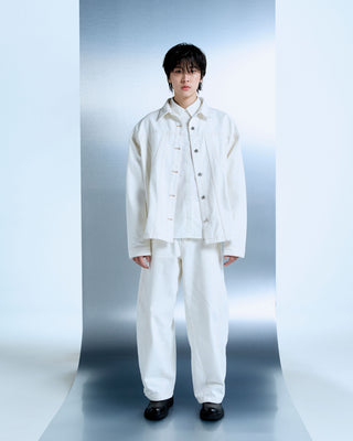 Structured cotton denim jacket cut to an oversized silhouette. Finished with custom hardware and barrel-shaped sleeves that introduce subtle volume through shape rather than scale.
