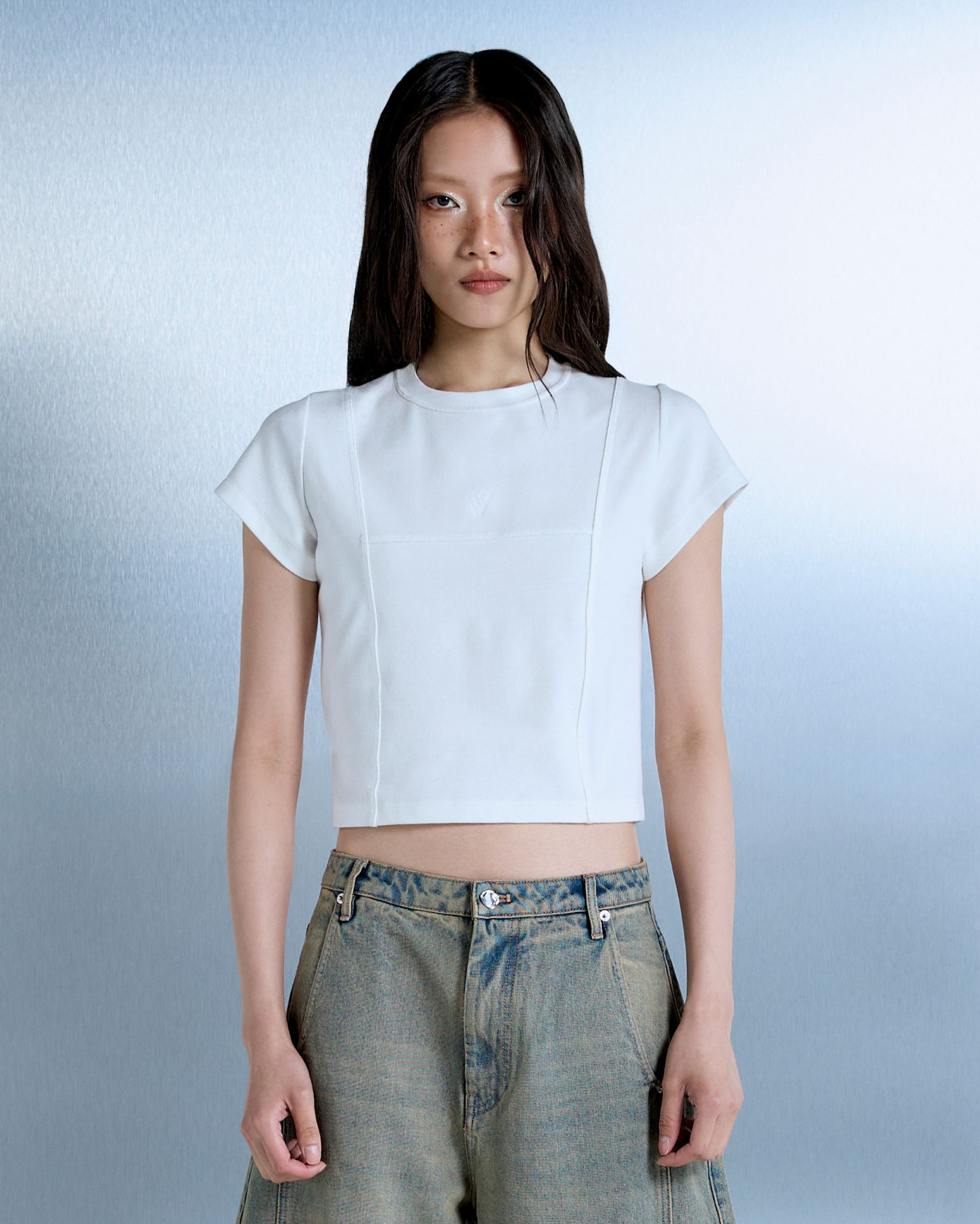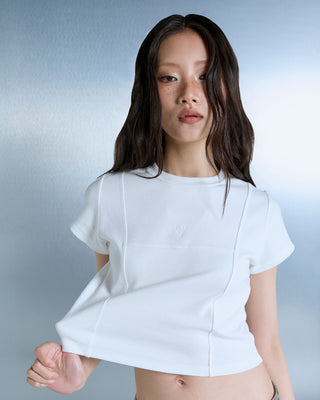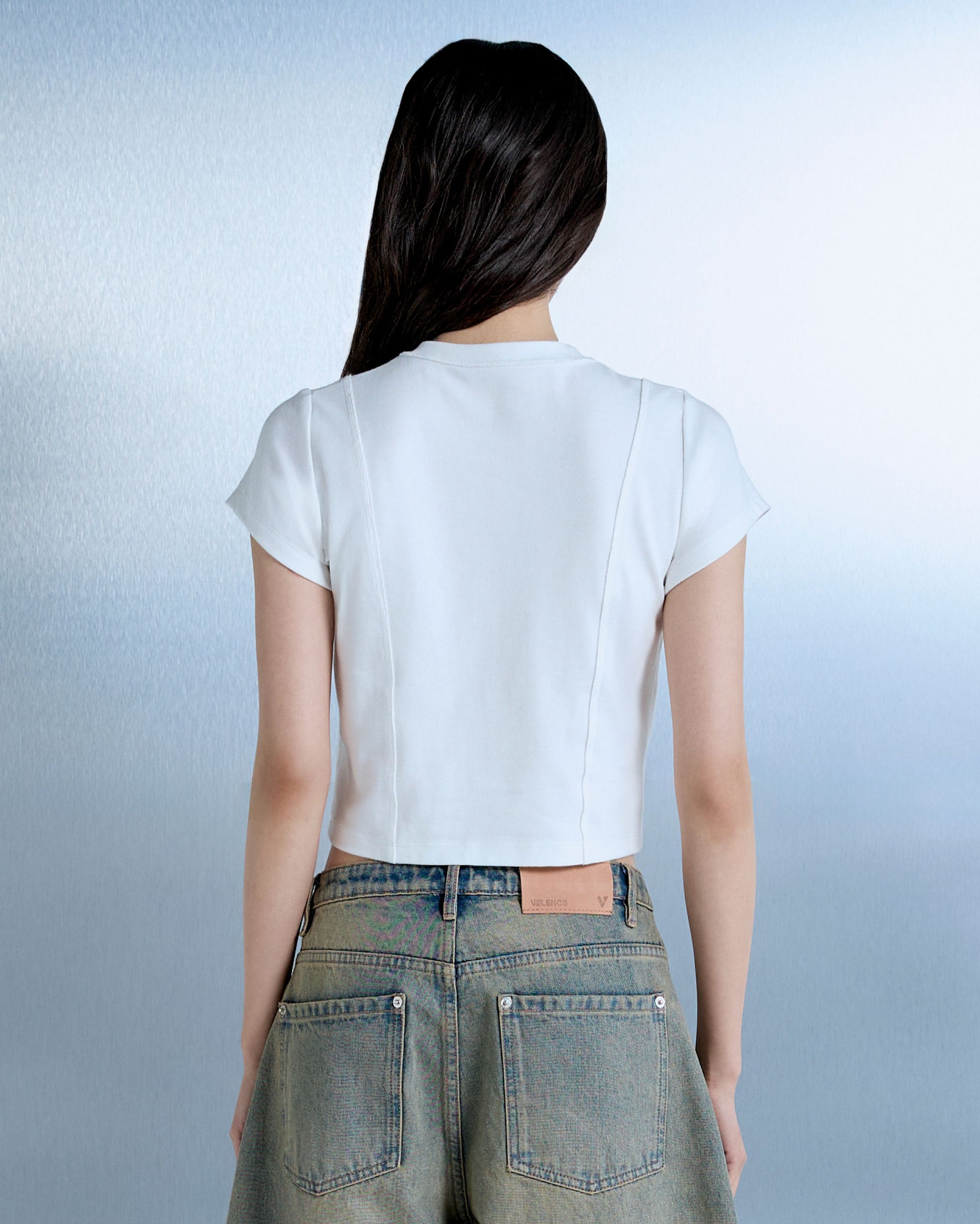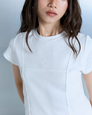 Slim-fit baby tee crafted from a cotton-blend fabric with natural stretch, cut for a clean, curvy silhouette. Finished with monochrome VELENCE logo embroidery.