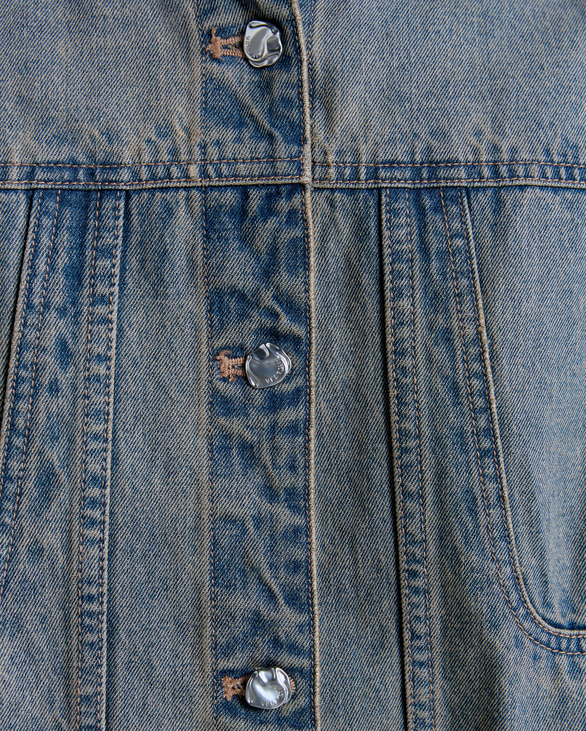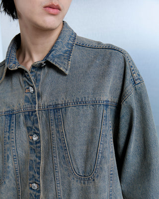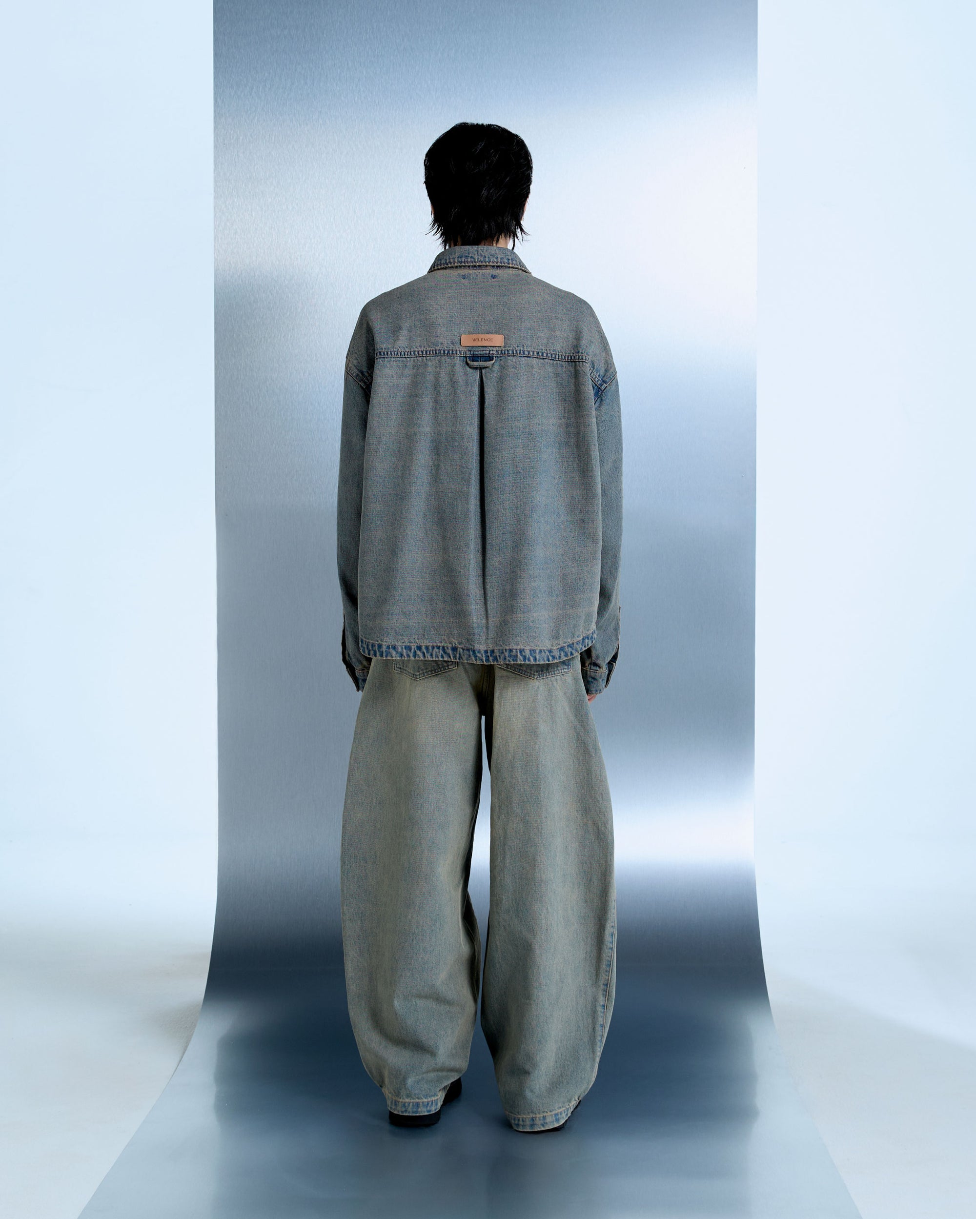 Structured cotton denim jacket cut to an oversized silhouette. Finished with custom hardware and barrel-shaped sleeves that introduce subtle volume through shape rather than scale.