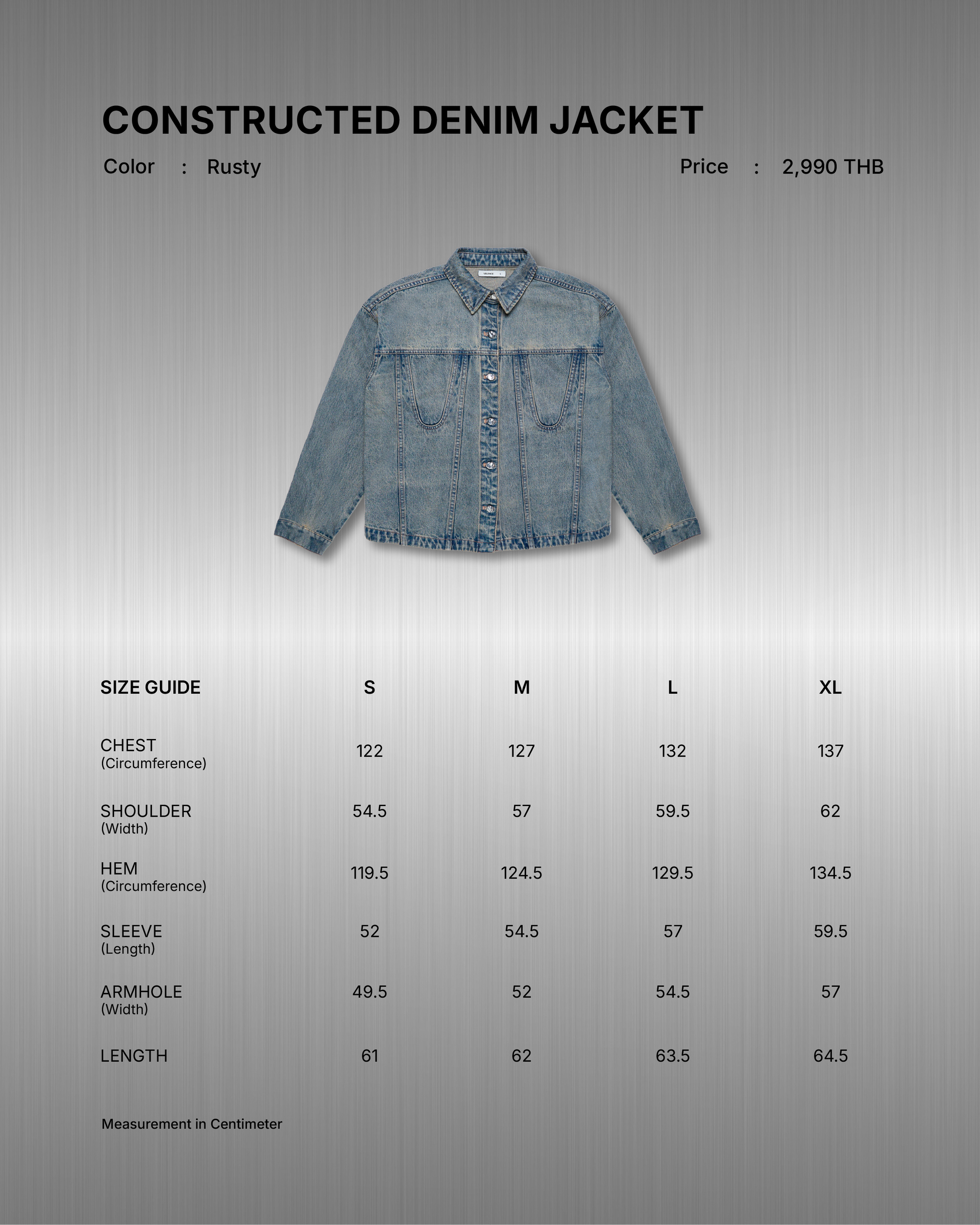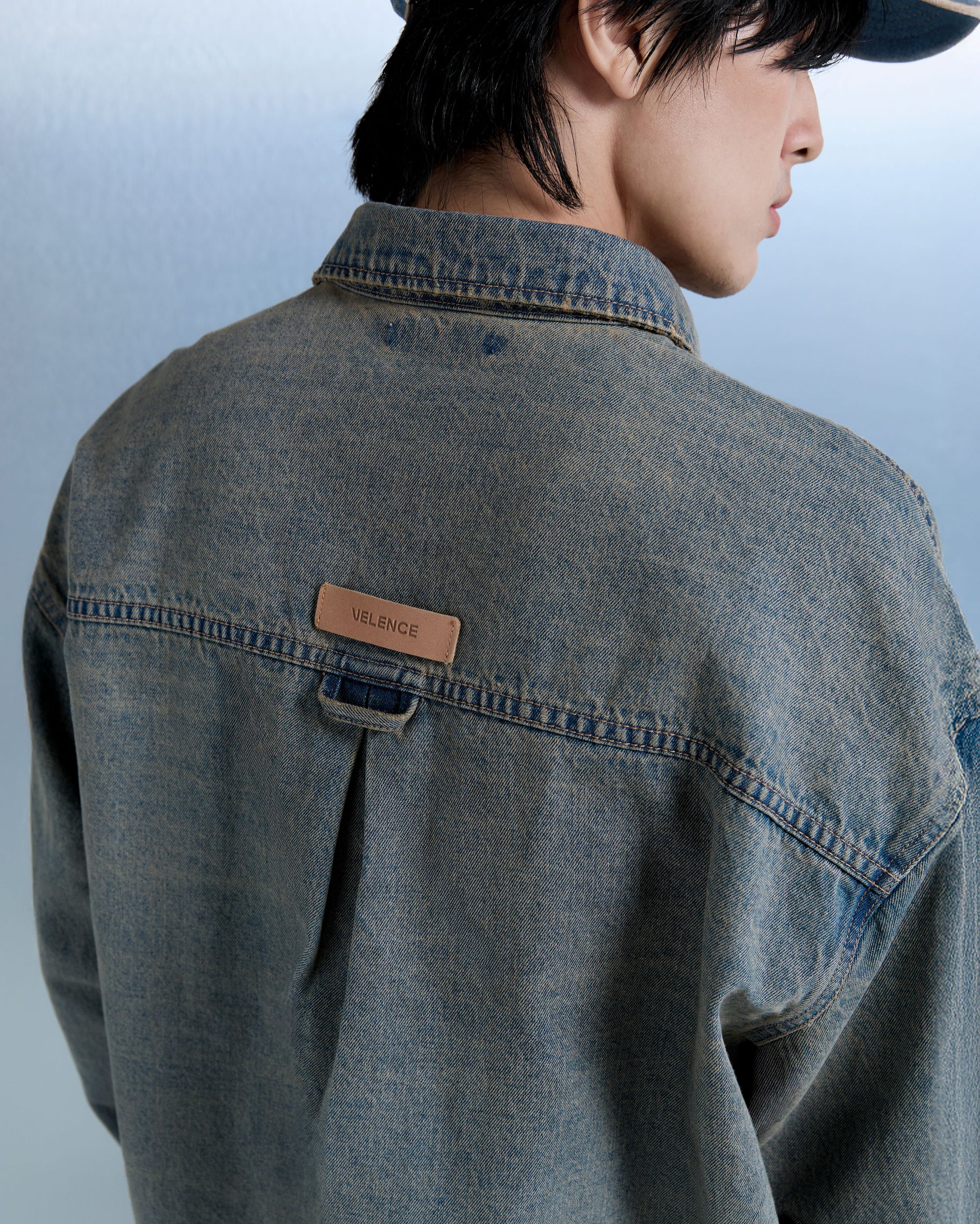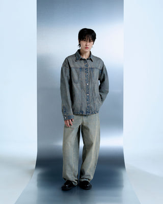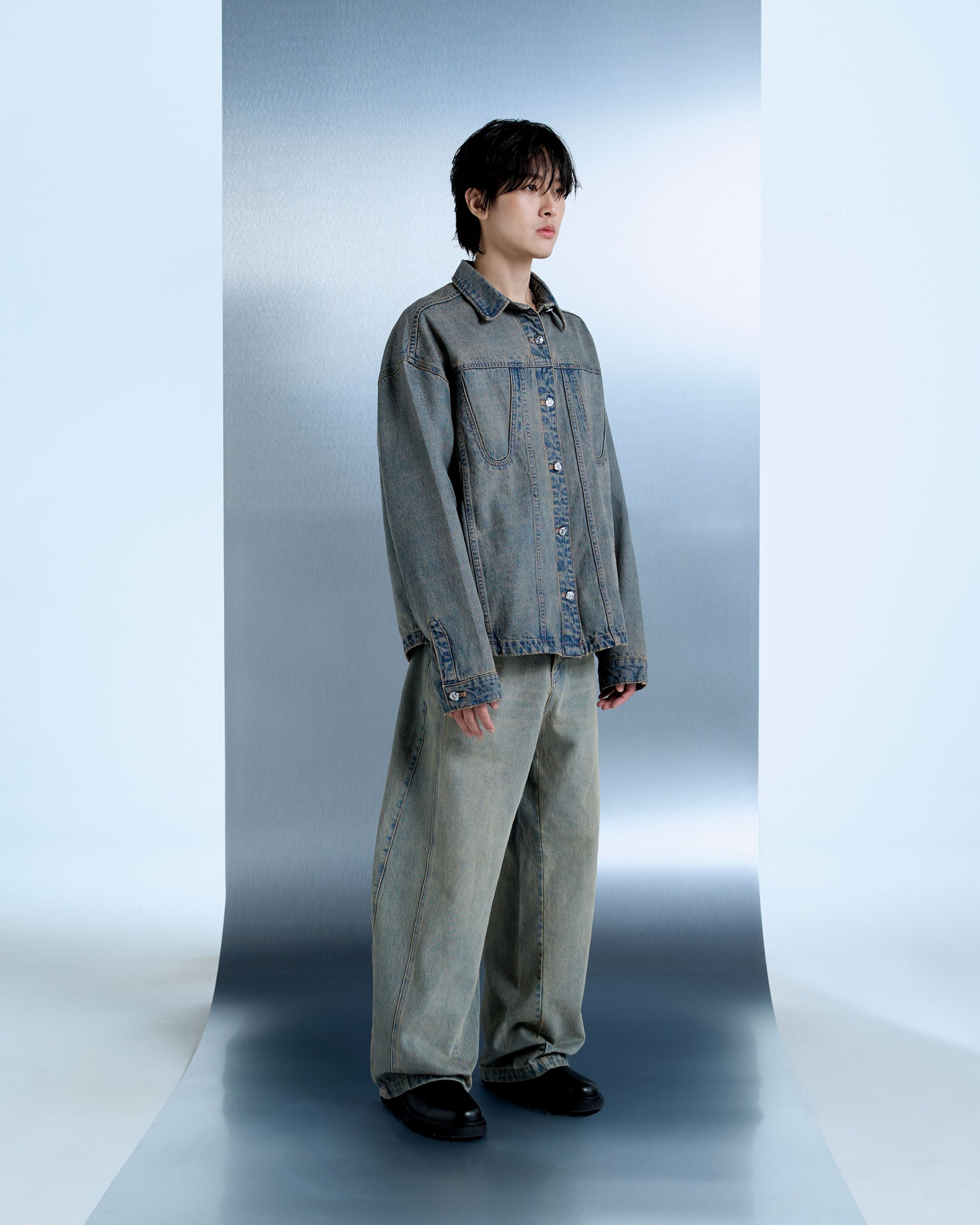 Structured cotton denim jacket cut to an oversized silhouette. Finished with custom hardware and barrel-shaped sleeves that introduce subtle volume through shape rather than scale.