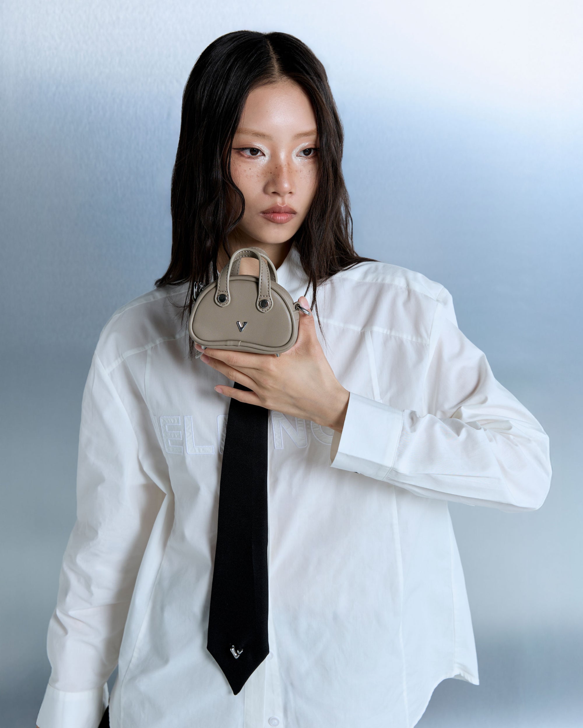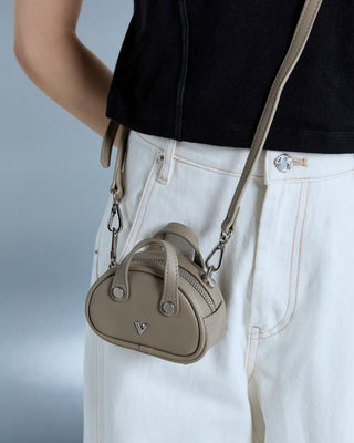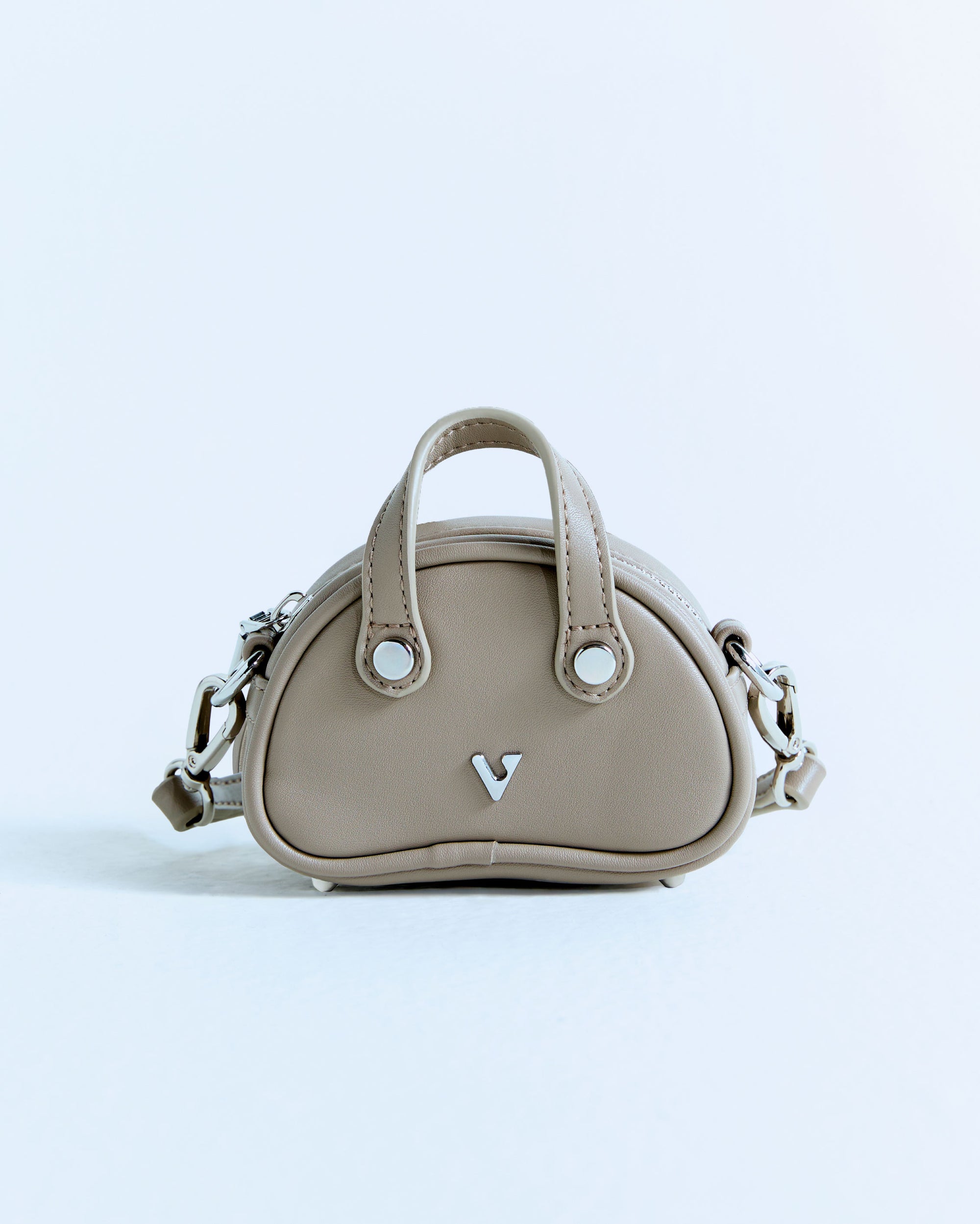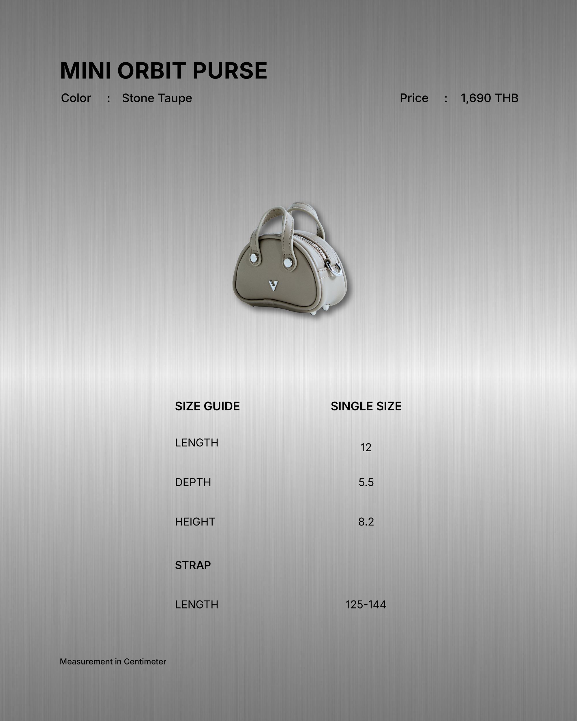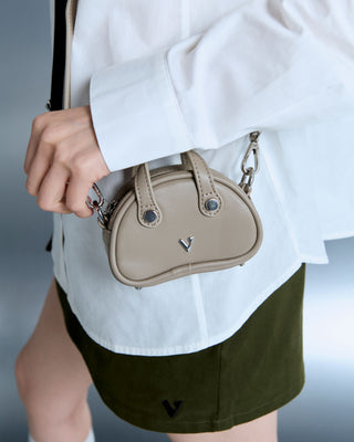 Mini Orbit Purse crafted from smooth vegan leather, designed to maintain a defined silhouette. Finished with a V logo plate, a top zipper closure, and an adjustable crossbody strap. Includes a dedicated hoop for attaching a keychain.