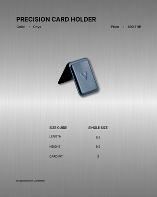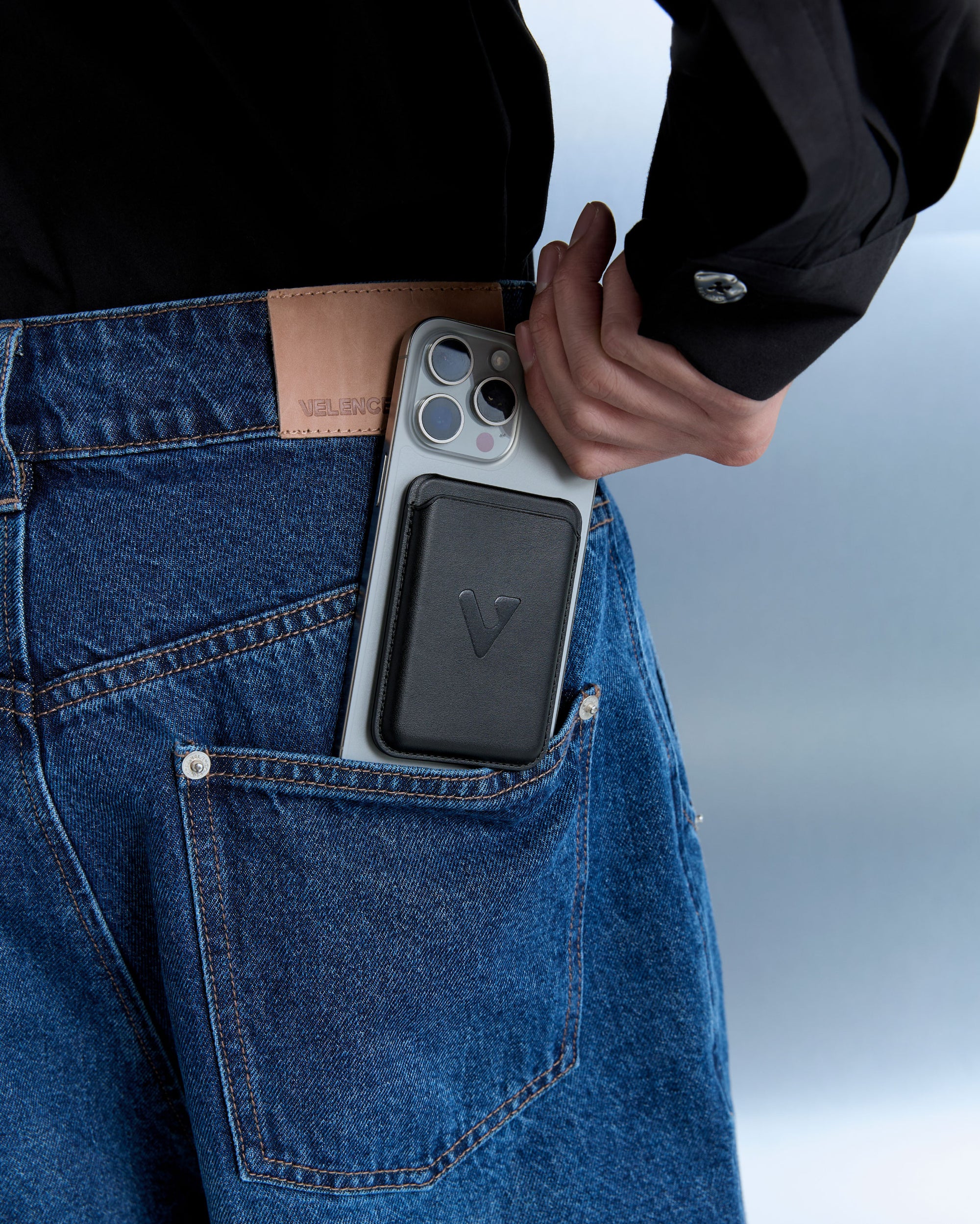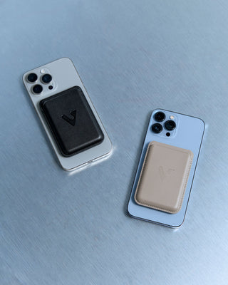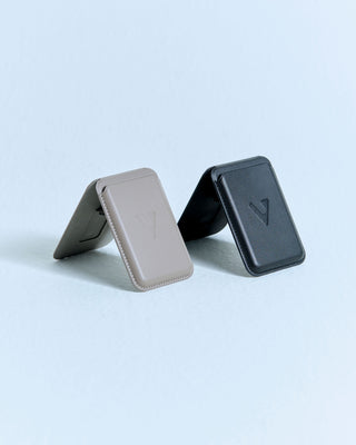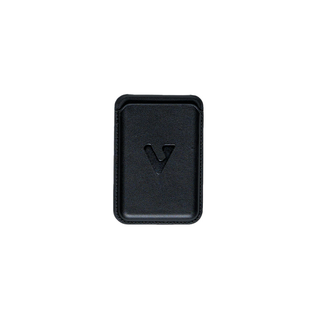 Magnetic card holder crafted from smooth vegan leather, designed to hold up to three cards. Finished with a debossed V logo.